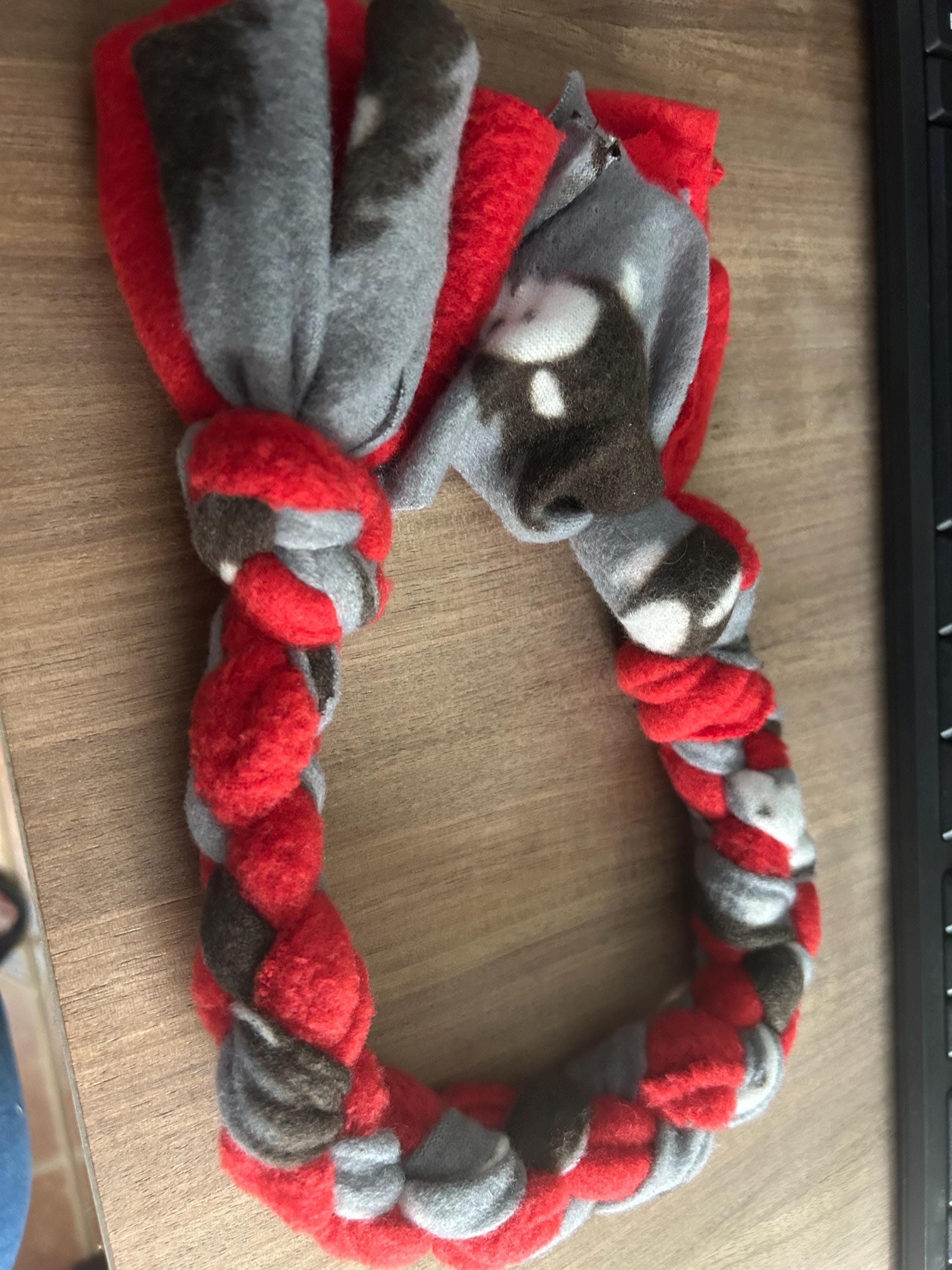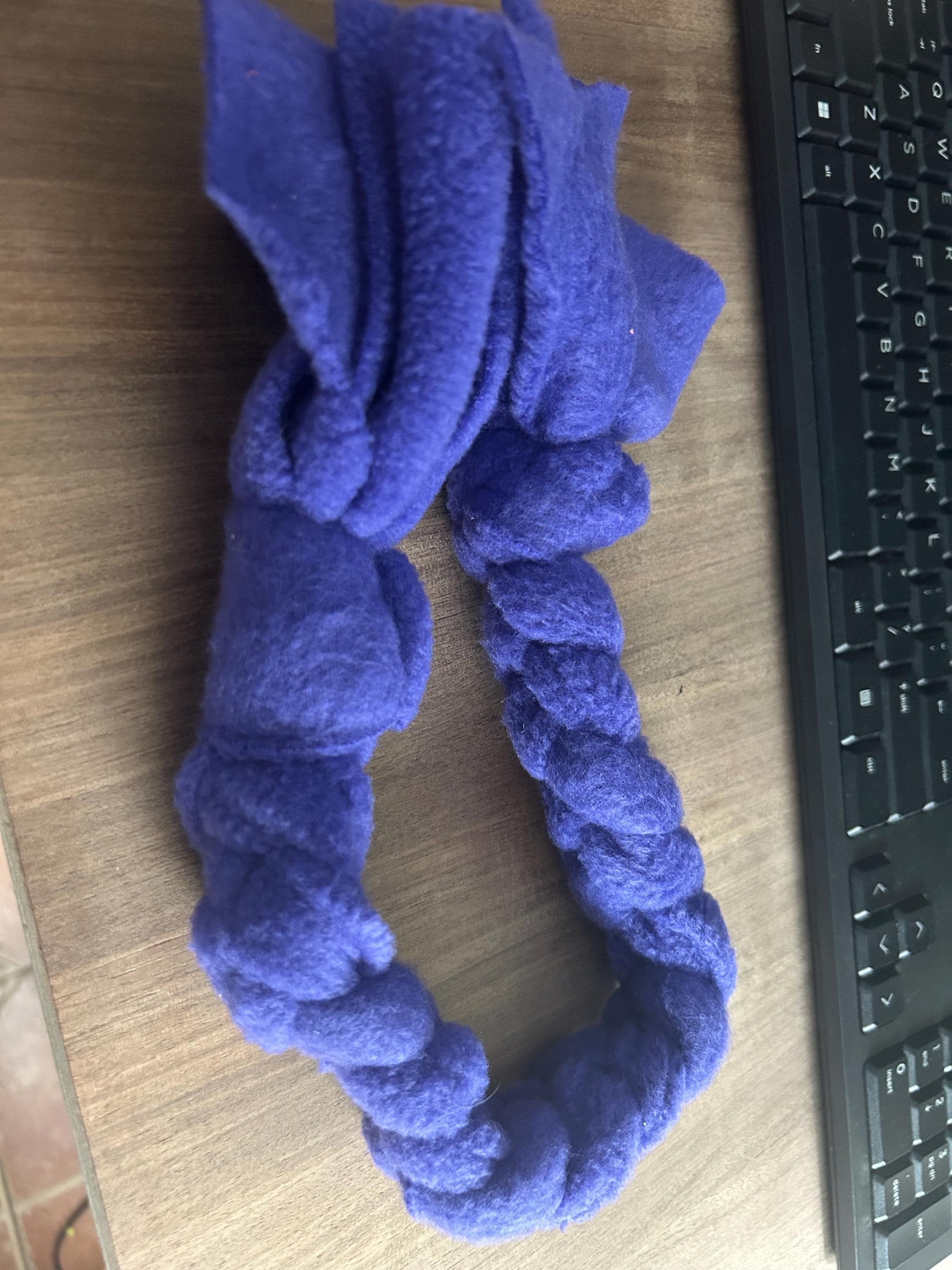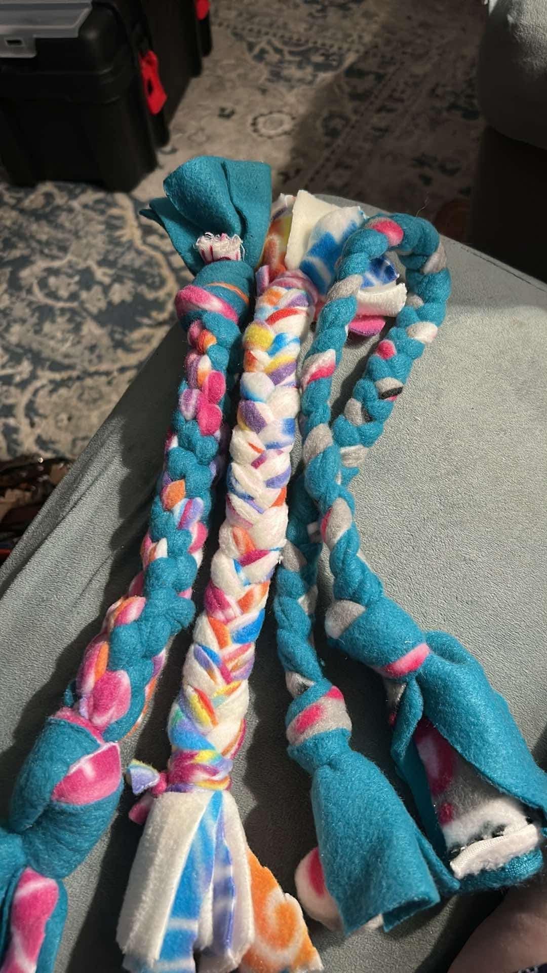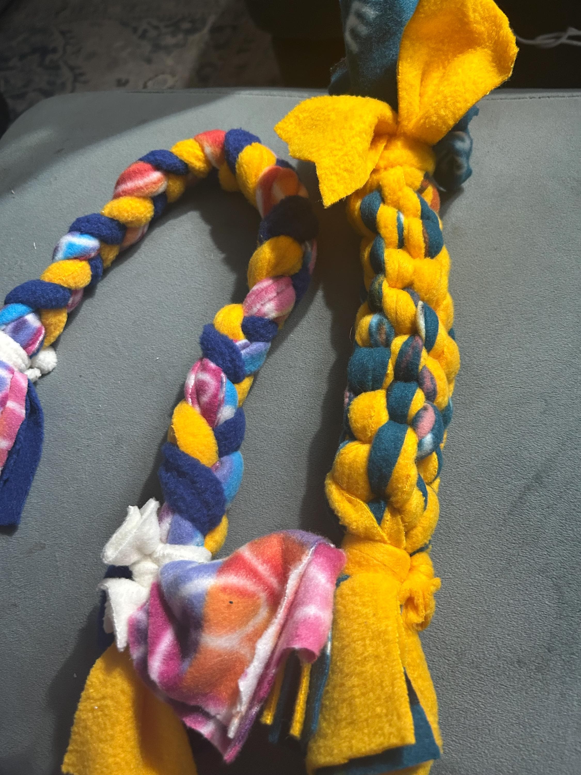 Hand braided fleece dog tug toys. Great for playing fetch or tug with your special friend. Machine Washable.