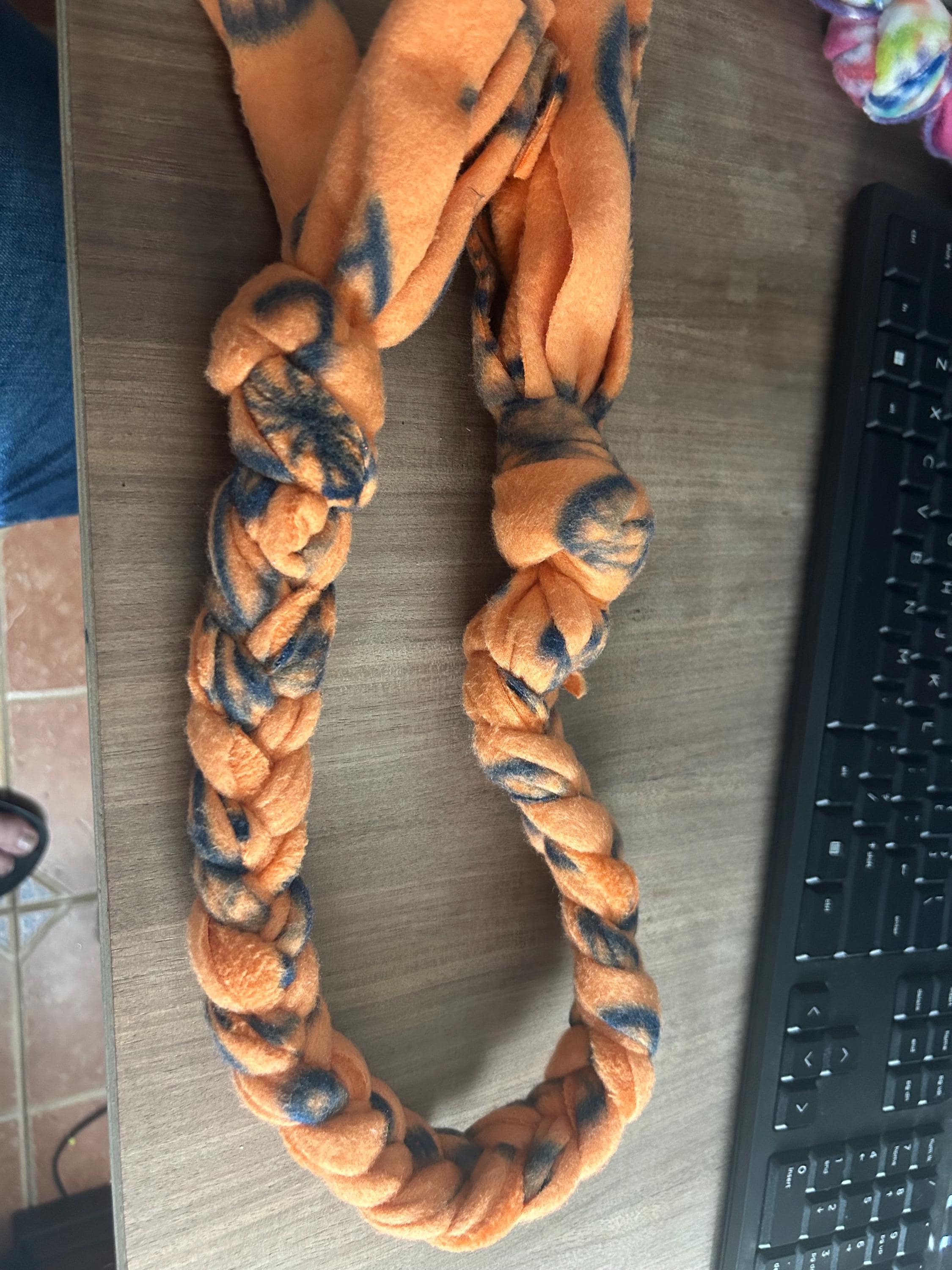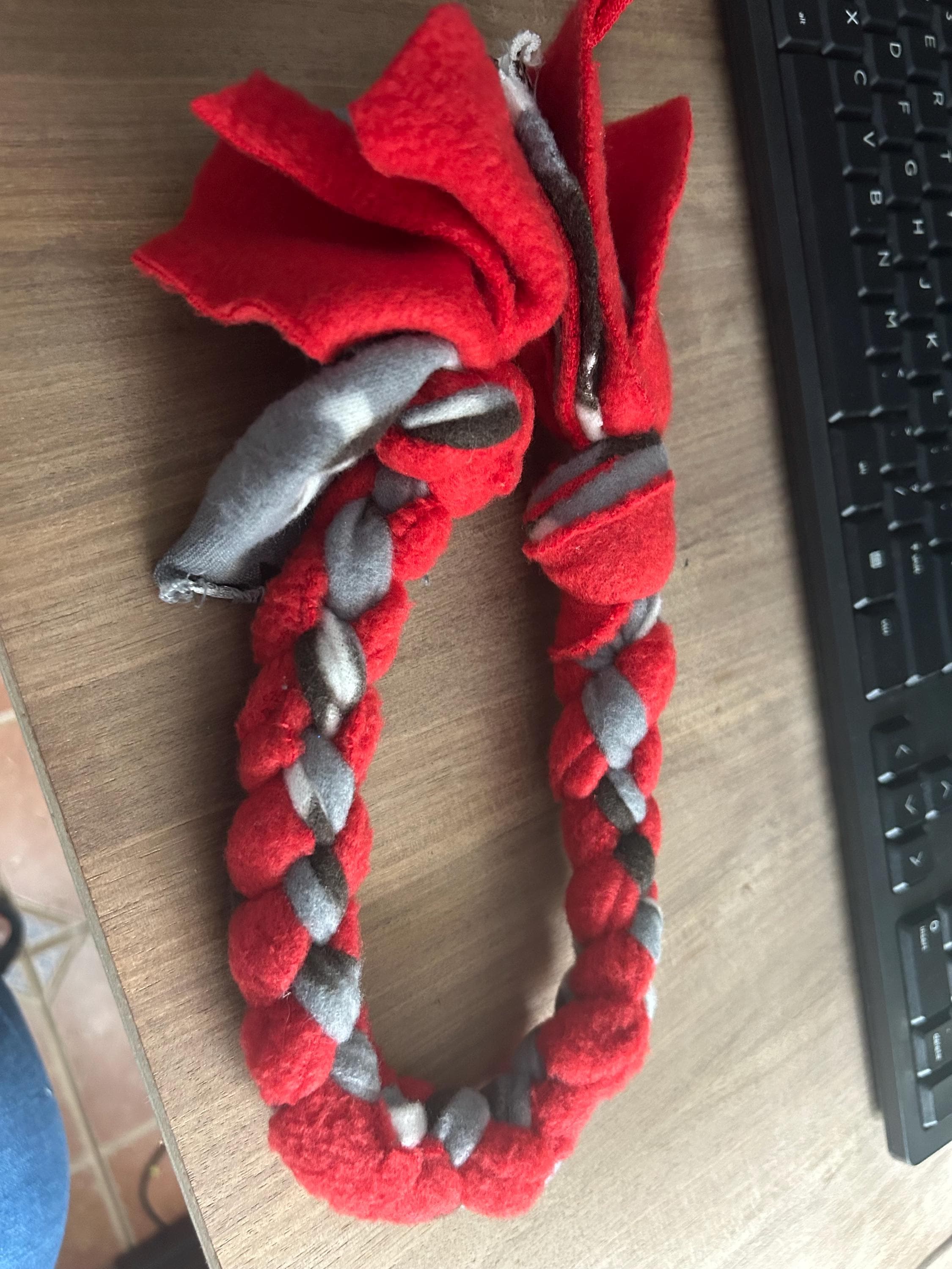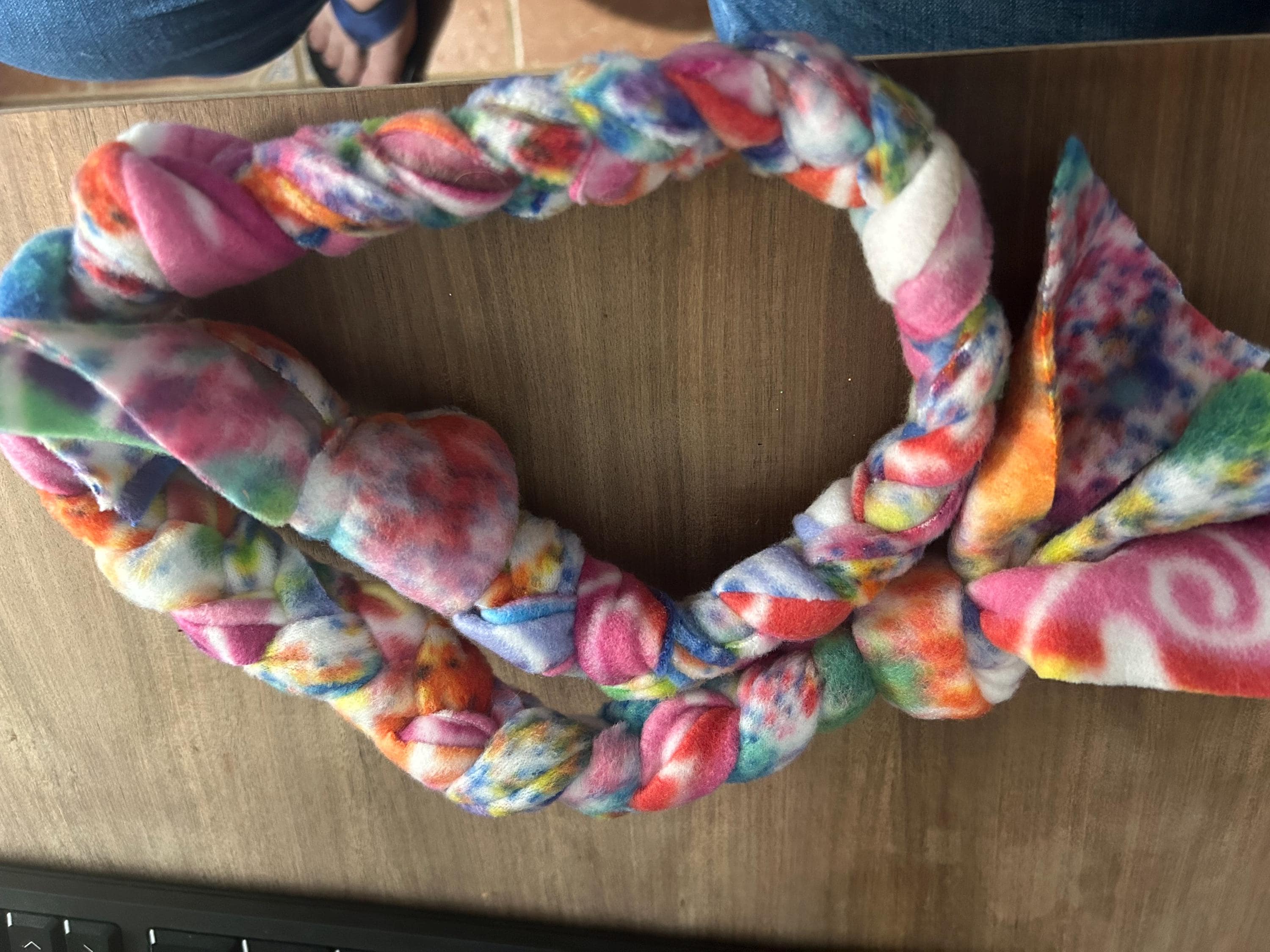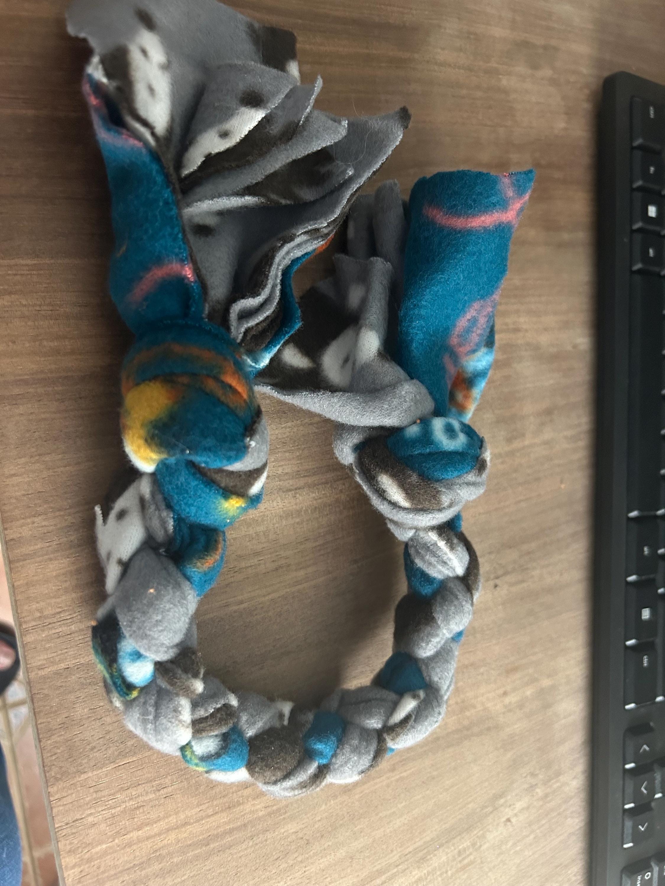 Hand braided fleece dog tug toys. Great for playing fetch or tug with your special friend. Machine Washable.
