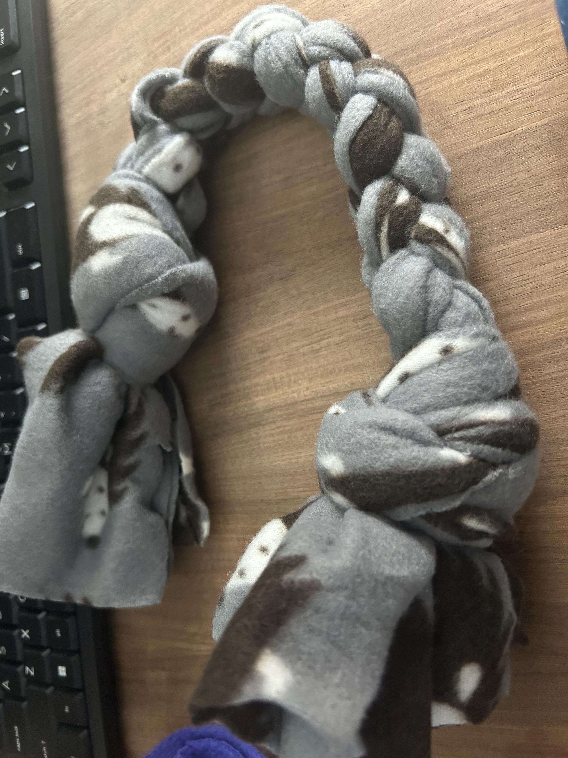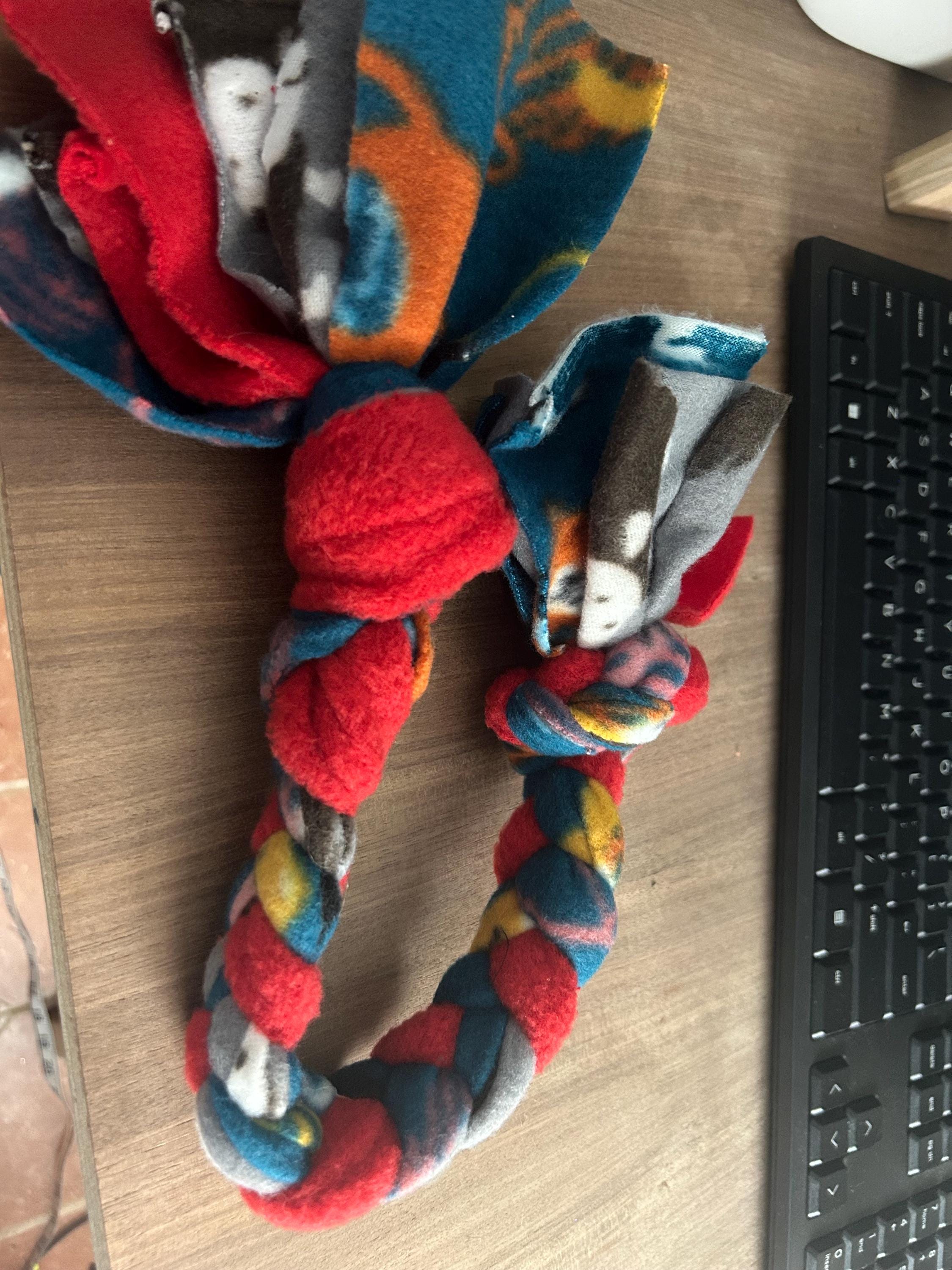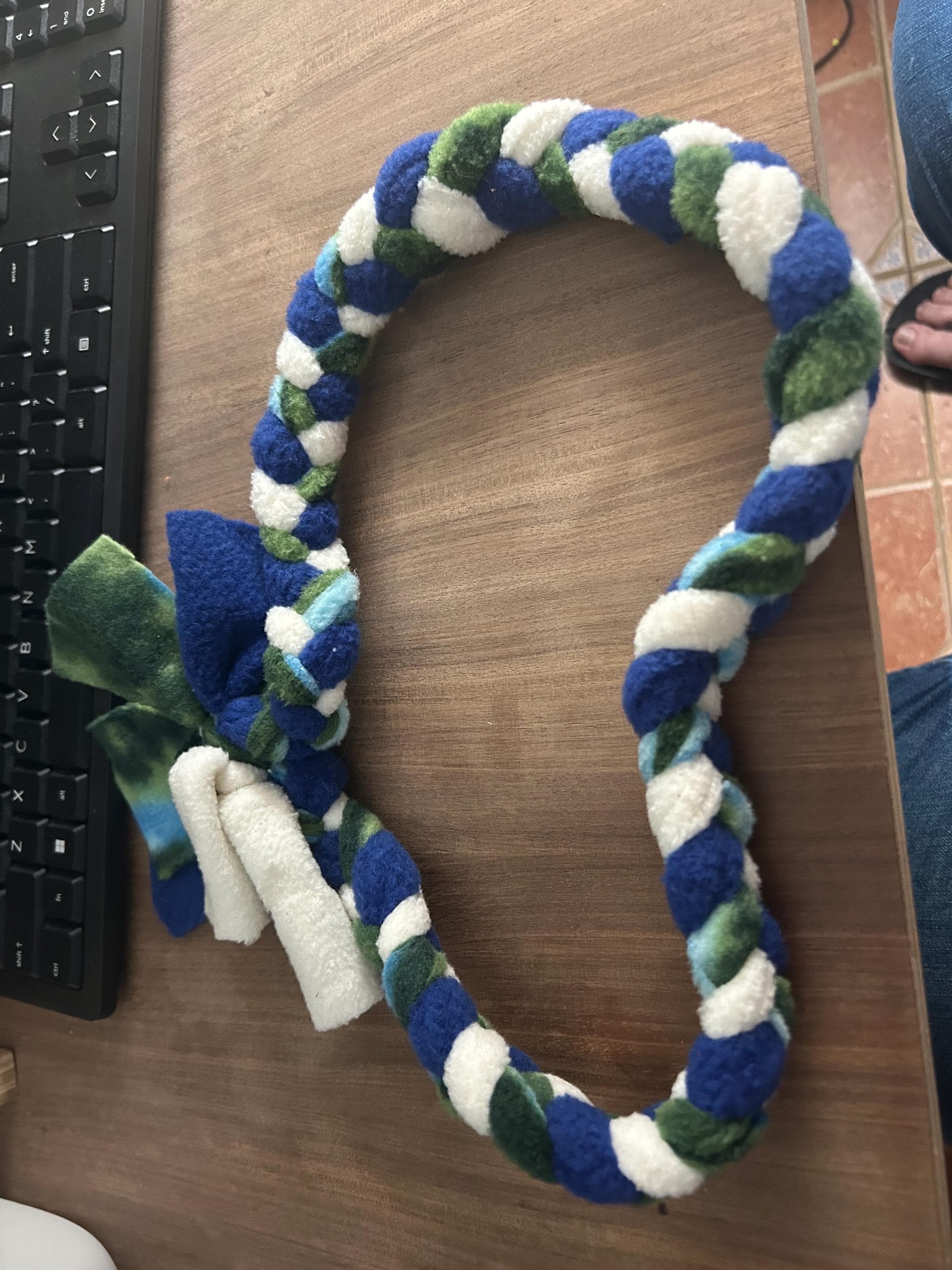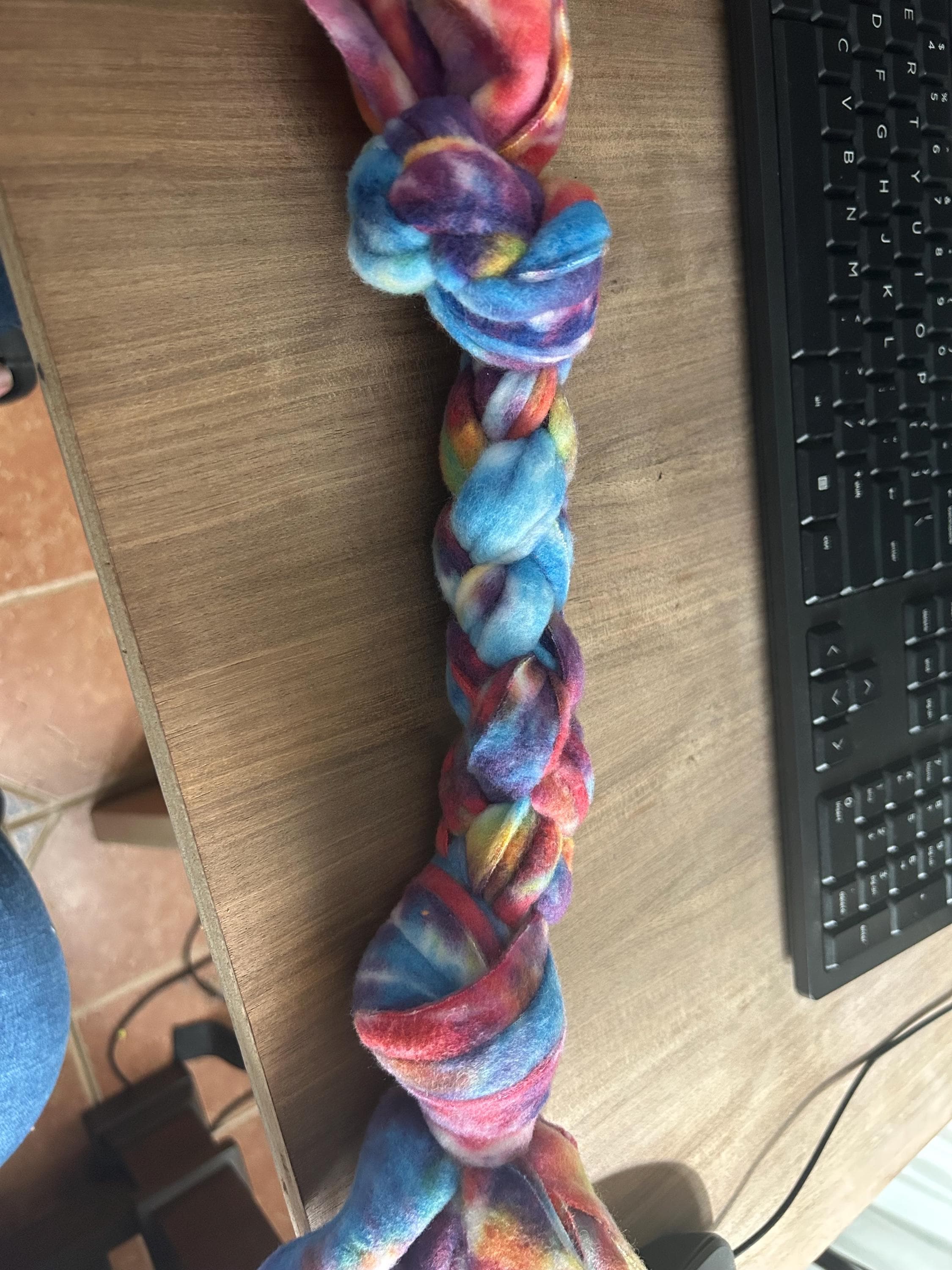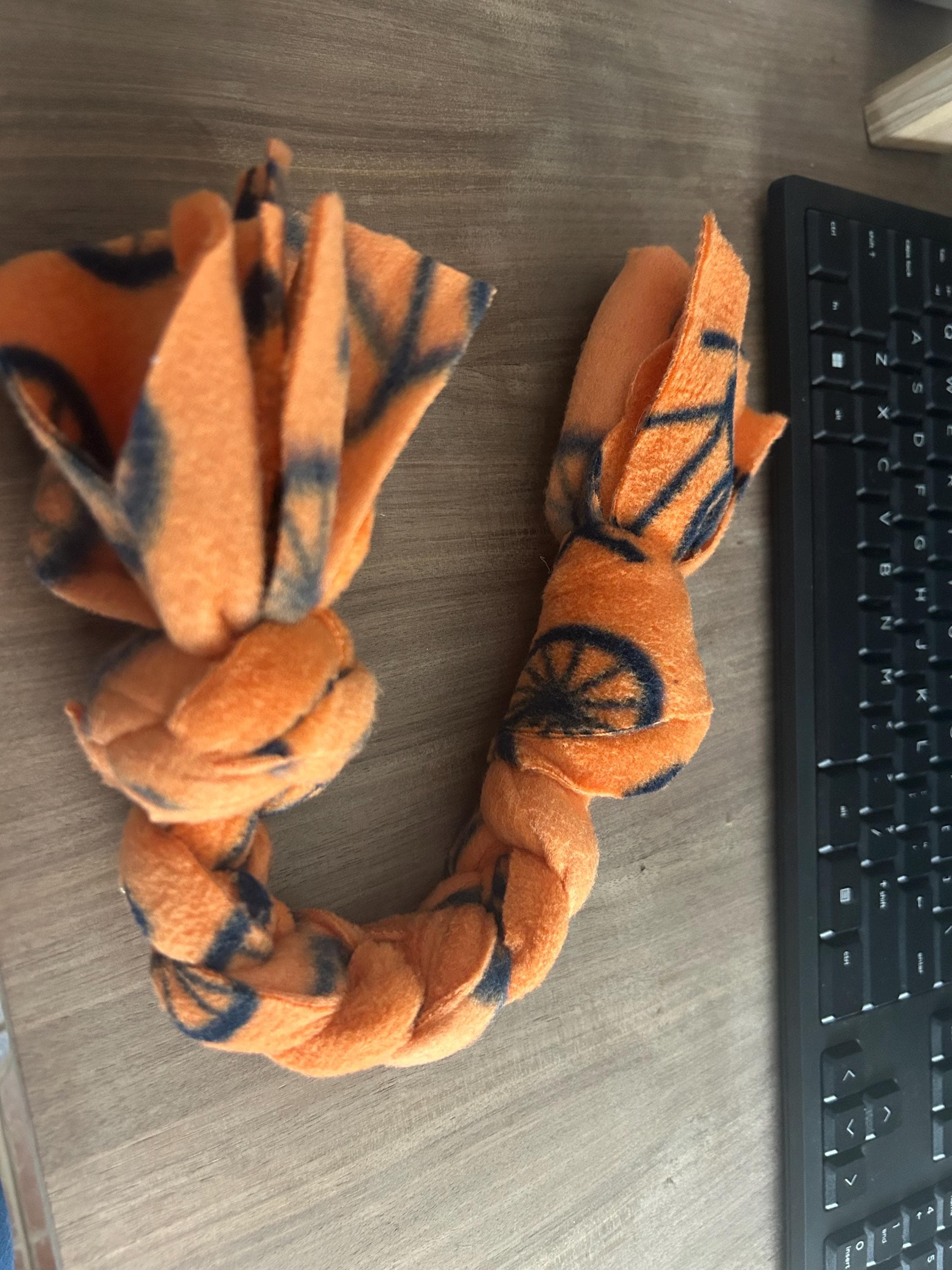 Hand braided fleece dog tug toys. Great for playing fetch or tug with your special friend. Machine Washable.