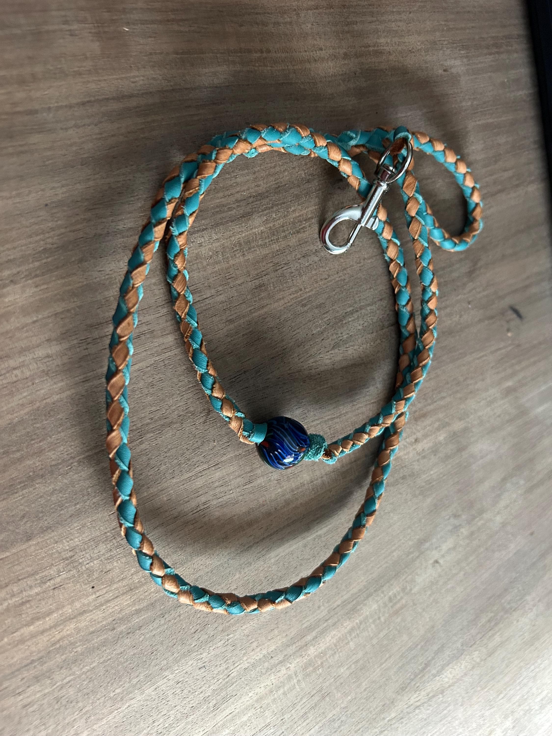 Tan & Teal 46" Deerhide Braided Show Lead with Accent Bead