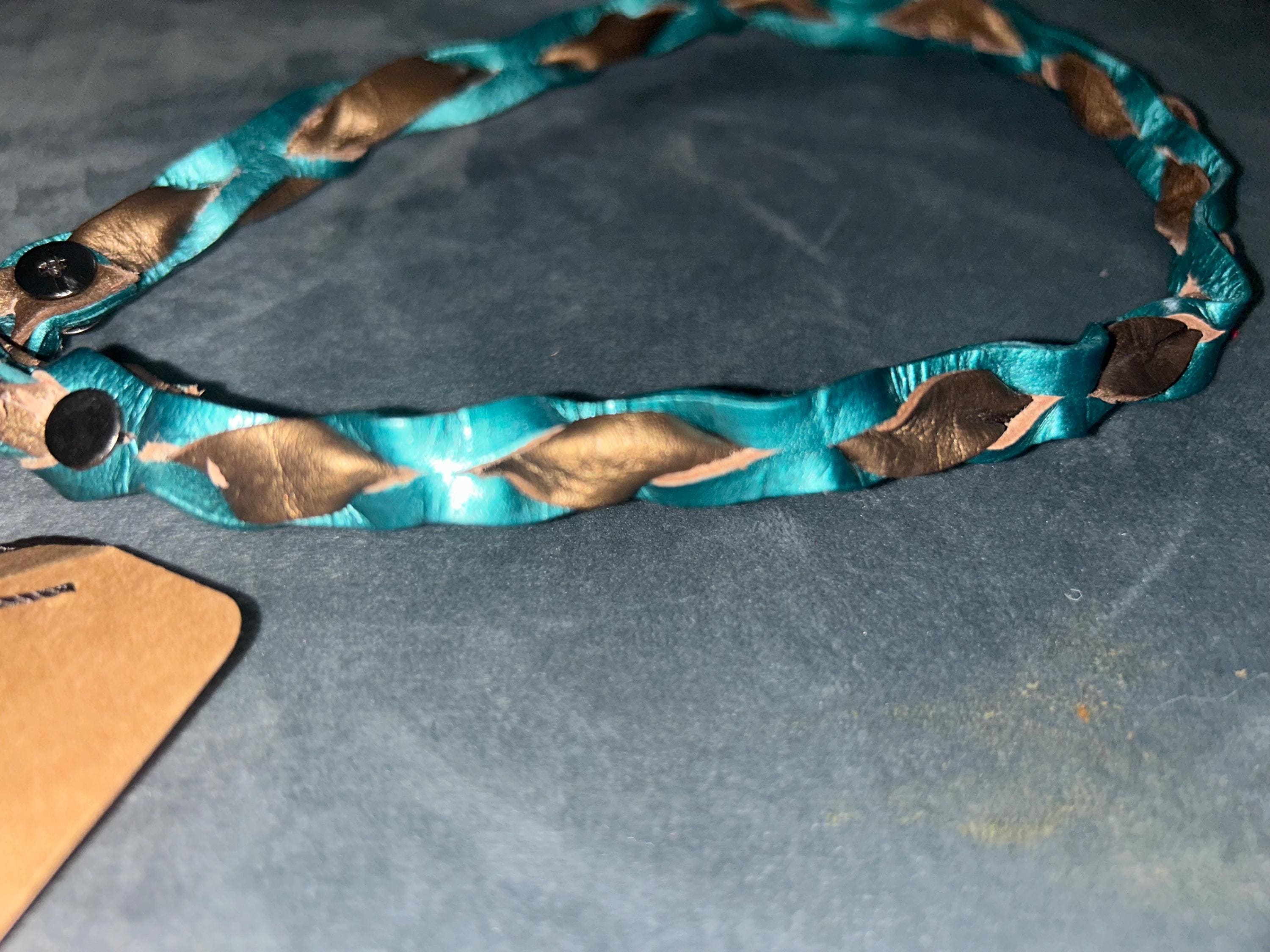 Premium hand-braided leather in turquoise and olive tones