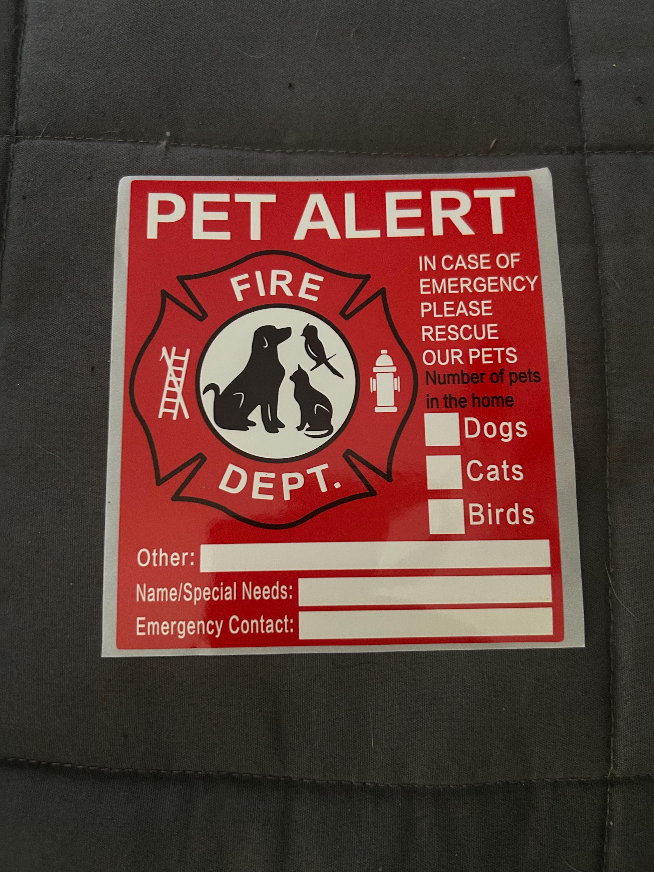 Alerts emergency personnel that pets are inside